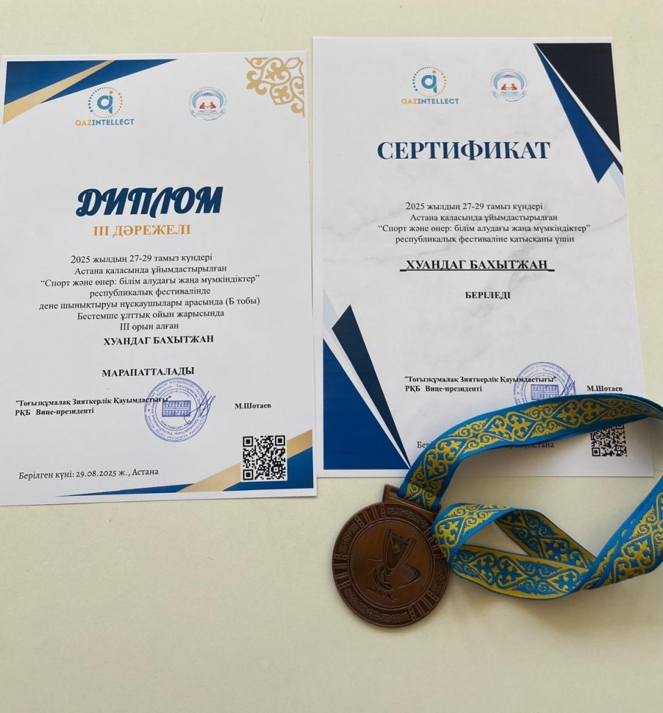 2025 жылдың 27-29 тамыз күндері Астана қаласында ұйымдастырылған «Спорт және өнер: білім алудағы жаңа мүмкіндіктер» республикалық фестивалінде дене шынықтыру нұсқаушылары арасында (Б тобы) Бестемше ұлттық ойын жарысында дене тәрбие нұсқаушысы Хуандаг Бахытжан III орынға ие болды!!! Құттықтаймыз!!!