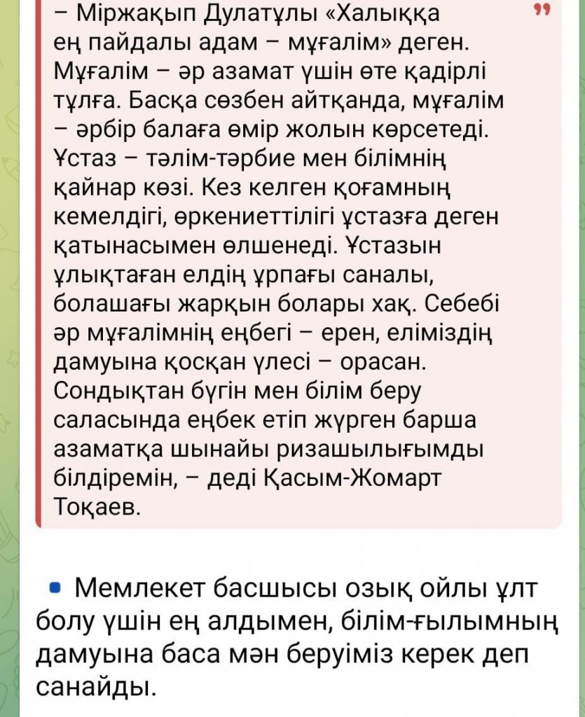 Қасым-Жомарт Тоқаев ұстаз болу нағыз білікті, дарынды,шебер маманның ғана қолынан келетінін айтып өтті. Президент мұғалімнің еңбегі соған сай лайықты бағалануға тиіс екеніне тоқталды.